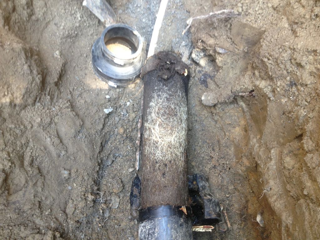 Dommages causés par les racines : la conduite avait été remplacée il y a dix ans par une autre entreprise. Une bague mal serrée avait permis à une petite racine de s’infiltrer à l’intérieur du conduit, où elle s’est ensuite multipliée jusqu’à provoquer une obstruction.